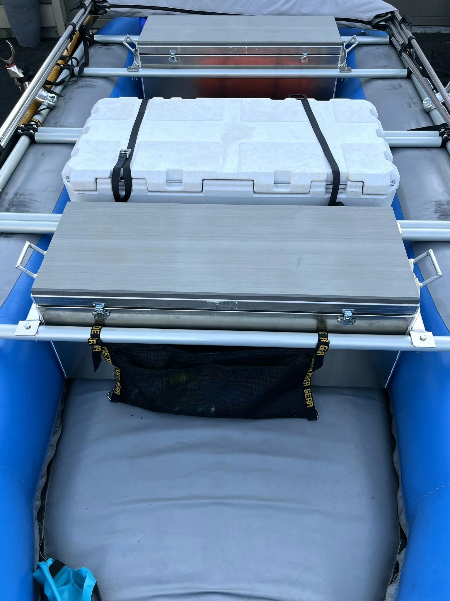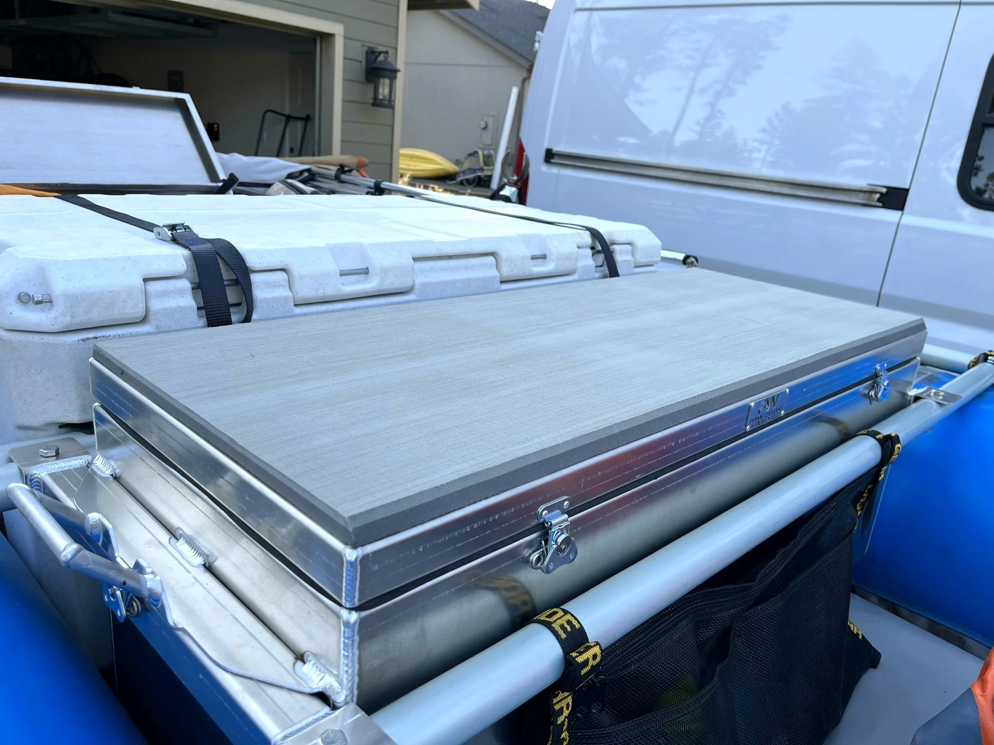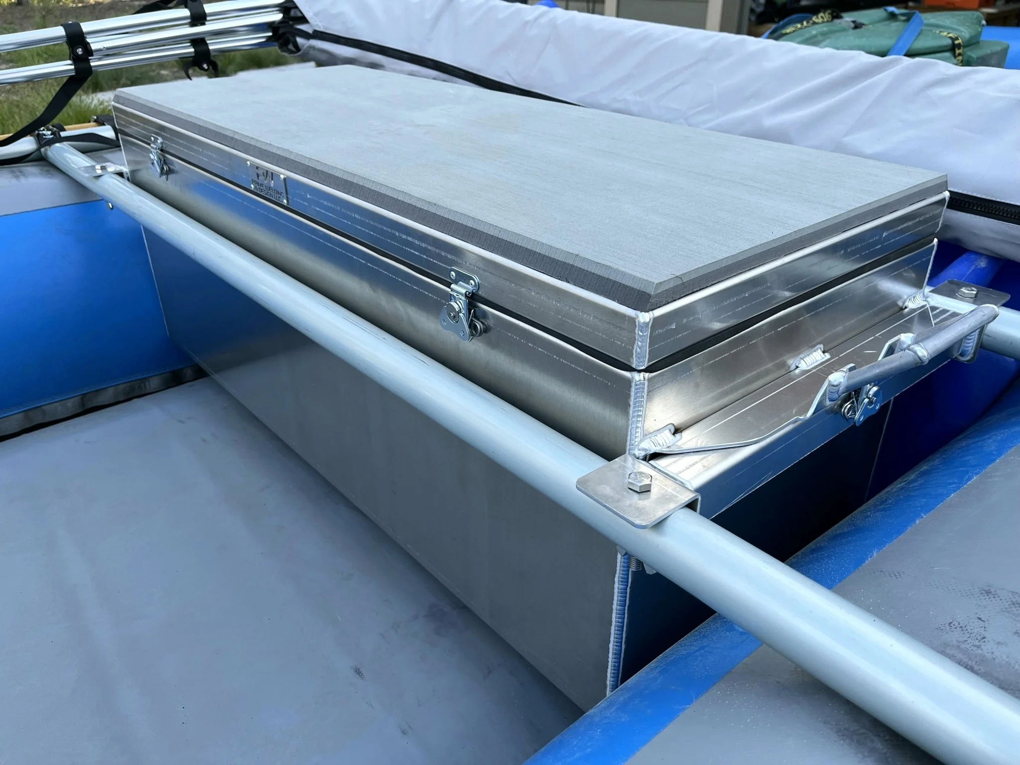 On this Custom aluminum Dry Box Build our customer wanted a Standard Dry Box Design but wanted an alternative way to latch in their box. Together we decided to go with a Spanner bar System that bolted to the existing raft Frame that allowed the customer to use latches to secure the Box to the frame. This Design is critical for accessing your dry box without unstrapping it from the frame.
